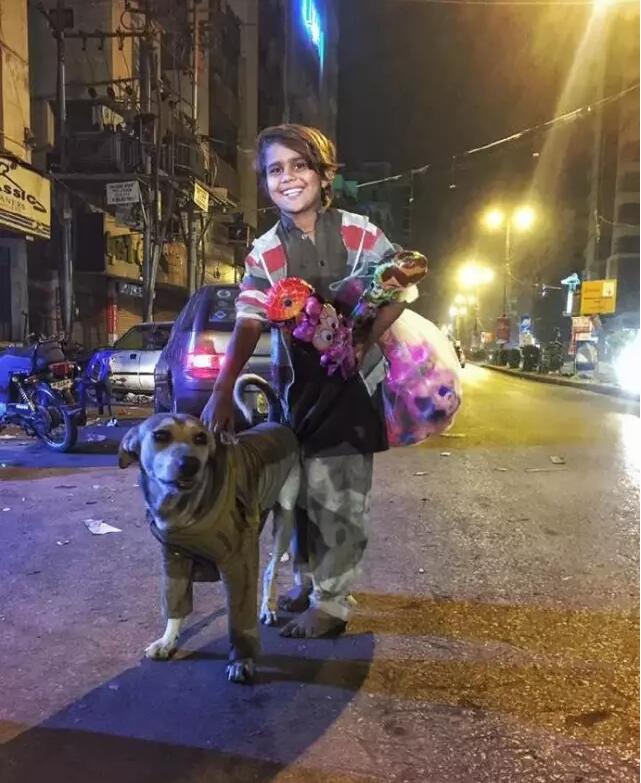 巴基斯坦一位制片人在街頭拍下了這樣一幕:夜晚的街道,一個(gè)衣衫襤褸沒有鞋穿的小男孩,把自己最寶貴的長袖毛衣穿在了心愛的小狗身上。天雖然冷,但他笑得很溫暖,仿佛擁有了全世界。