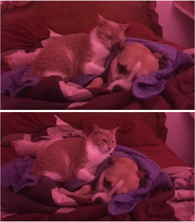 一個(gè)ins上的樓主分享了自己家貓和狗的感人故事:有人放煙花聲音很大,家里的狗狗很害怕,到處焦慮地跑來跑去找地方想躲起來……這時(shí),他們家的貓走到狗身旁,溫柔地抱住它,就這樣陪了狗狗一整晚。