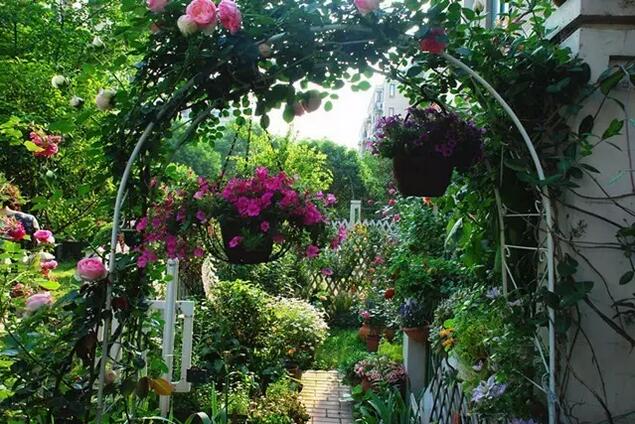 各個品種的鐵線蓮、月季、百合花、繡球花爭奇斗艷,玫瑰花墻露出院子外,讓路過的人都忍不住駐足流連。